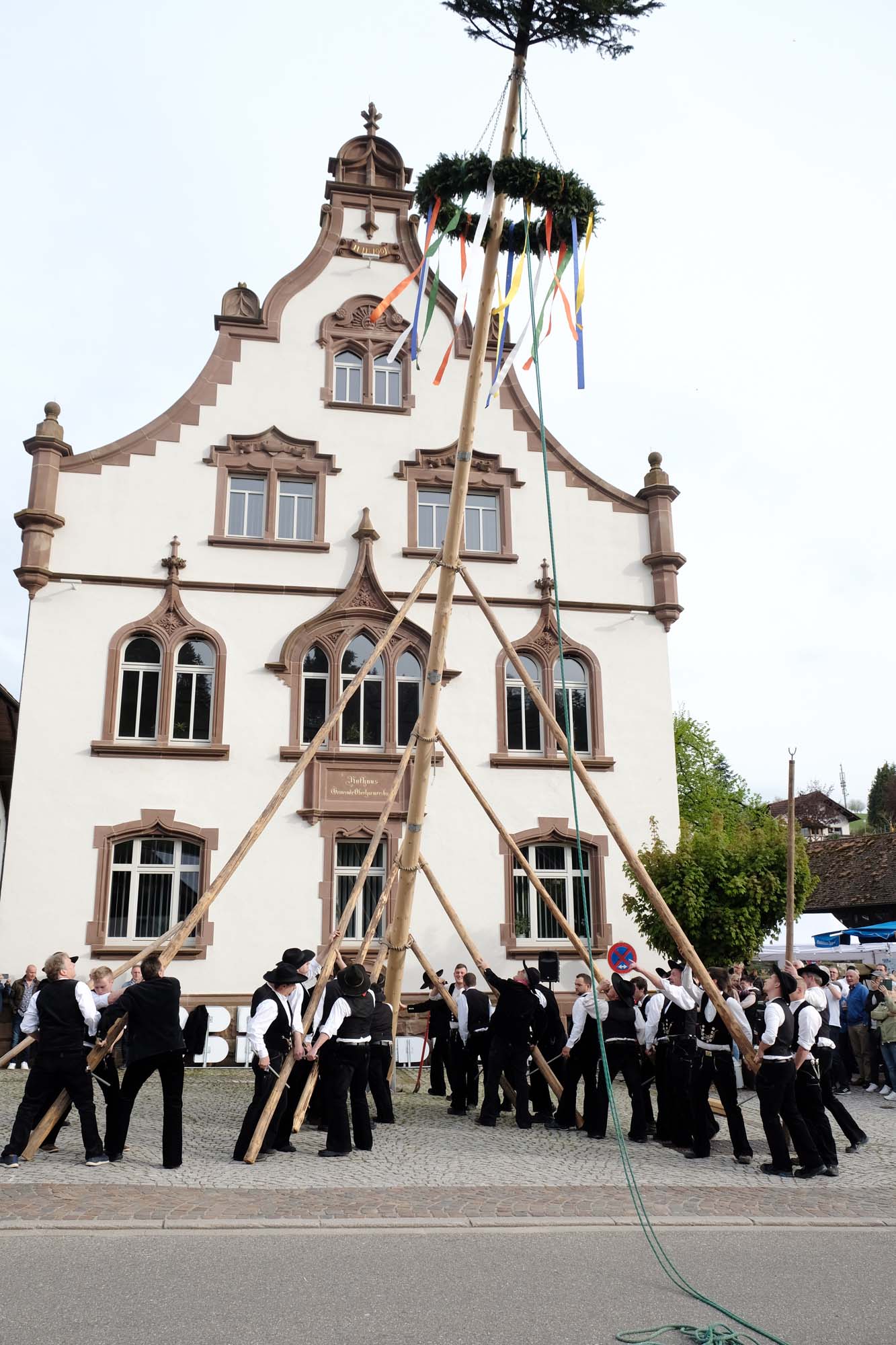 Am frühen Sonntagabend ist der Maibaum wie vorgesehen in die für ihn vorgesehene Hülse vor dem Rathaus gerutscht. Zimmermänner hatten ihn mit reiner Muskelkraft aufgerichtet, was hunderte Besucher beklatschten und im Anschluss beim großen »Mai-Fescht« auf dem Rathausplatz begossen.