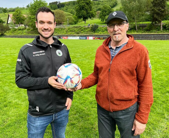 Die Ballspende für das Derby gegen den Zeller FV kommt von Rudolf Kornmayer. Er war früher selbst für den SVO aktiv; heute spielt sein Sohn Daniel im Dress des SVO. Für die noch ausstehenden Saisonspiele wünscht er der Mannschaft viel Erfolg und im Derby soll das neue Spielgerät mindesten einmal mehr im gegnerischen als im einheimischen Tor landen. Auf dem Bild übergibt er den neuen Ball an SVO-Abwehrchef Marcel Lehmann.