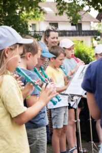 Zwei flockig-fröhliche Geburtstagsständchen kredenzte Felix der Glückliche in Begleitung von Bernhard. Für weitere musikalische Umrahmung sorgte das Jungmusiker-Ensemble des Oberharmersbacher Musikvereins sowie die Flötenband. Und auch die Kindervolkstanzgruppe erntete kräftigen Applaus. Mit viel Elan trotzte sie den hohen Temperaturen.