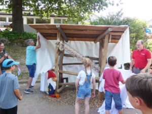 Auch sonst war viel auf dem Schulhof und dem weitläufigen Schulgelände los. Das lag an den acht lustigen Spielplätzen, die eigens für Hademars Geburtstagsfest aufgebaut worden waren und von Ortsvereinen betreut wurden: Bärenzunft, DJK, DRK, Freiwillige Feuerwehr, Förderverein und Elternbeirat Kinderhaus Sonnenblume, Landfrauen, SVO, TCO. Die Kinder, die an jedem der Spiele mitgemacht und dadurch insgesamt acht Stempel gesammelt hatten, durften einen Gewinnspielschein ausfüllen und dem Postboten-Hademar in die Tasche werfen. 159 Rückläufe waren es am Ende des Tages, unter denen insgesamt zehn Preise ausgelost werden.