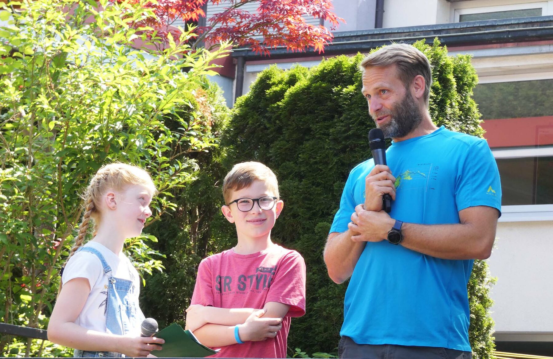 Auch sonst ging es alles andere als steif zu auf diesem Geburtstagsfest. Wie bei dem Interview mit Stargast Tobias Ohmann, vom Kika-Kinder-TV als „Wildnis-Coach Tobi“ und zudem als Autor bekannt. Diesmal waren es die Grundschüler Johanna und Jonathan, die das Gespräch führten. Sie meisterten ihre Aufgabe am Mikrofon bravourös, stellten interessante Fragen und erhielten von dem sympathischen Erlebnispädagogen spannende, kurzweilige Antworten.