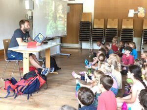 Auf dem Programm der beiden Samstagsaktionen am Vor- und Nachmittag standen, neben den Waldentdecker-Aufgaben, dem Versteckbau und den Wasserraketen bei den jetzt größeren Kindern auch noch Bogenschießen mit „echten“ Sportbögen und eine Autogrammstunde. Bei der abschließenden Feedbackrunde schauten Jill Löffler und Silvia Glatz, Erzieherin in der Naturgruppe des Kinderhauses, in leuchtende Kinderaugen. „Es war super und hat großen Spaß gebracht!“, so die gängige Rückmeldung. Der Montag war abschließend für alle Schulkinder der Brandenkopf-Schule reserviert. Im Rahmen des Lesewettbewerbs las Tobias Ohmann aus einem seiner drei Bücher vor. Eine Passage in „11 Tage allein im Wald“ handelte von Abenteuern im Zeltlager. Immer wieder hörte Tobi auf zu lesen und stellte den Kindern, die begeistert und gespannt zuhörten, Fragen zu den Textabschnitten. Auf die Frage, durch was wohl eine Maus in sein Zelt gelockt worden war, kam prompt die Antwort: „Käse“, worauf dann zur Belustigung aller verschiedene Sorten aufgezählt wurden. „Emmentaler“, „Gouda“, „Mozzarella“, sprudelte es aus den Kindern hervor. Der Wildnis coach zeigte auch andere Möglichkeiten auf: „Vielleicht habe ich auch einen Fisch gefangen und mir anschließend die Hände an der Hose abgewischt oder Seife in meinem Zelt vergessen“, so Tobi. „Genau deshalb packe ich alles, was für Tiere gut riecht und sie eventuell anziehen könnte, in eine Tonne. Diese stelle ich dann neben meine Feuerstelle und baue mein Zelt 100 Meter davon entfernt auf“. „Clever“, befand die Zuhörerschaft und freute sich darüber, einen kurzen Filmabschnitt von Tobis Sendung anschauen zu dürfen. Worauf er mit Fragen zur Serie und zu seinen Abenteuern gelöchert wurde. Abschließend gab er geduldig Autogramme und wurde von vielen glücklichen Kindern nach Hause verabschiedet.
