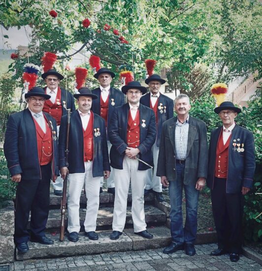 Wie die Tradition es will, hat die Historische Bürgerwehr Oberharmersbach am Fronleichnamstag ihre langjährigen Mitglieder geehrt. Dieses Jahr stand außerdem eine Ernennung zum Ehrenmitglied und drei Verabschiedungen auf dem Programm.