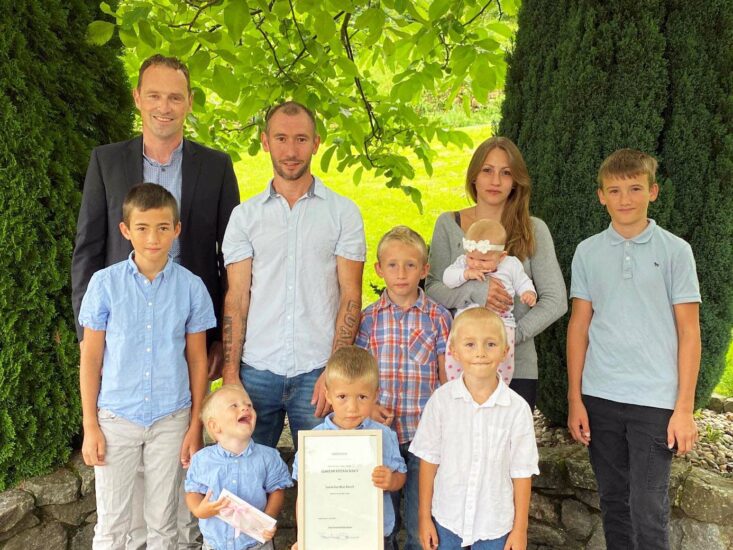 Im Rahmen eines gemütlichen Beisammenseins übergab Bürgermeister Richard Weith im Namen des Bundespräsidenten die entsprechende Patenschaftsurkunde und das Präsent an die stolzen Eltern. Der Bundespräsident bringt mit der Ehrenpatenschaft die besondere Verpflichtung des Staates für kinderreiche Familien zum Ausdruck. Sie stellt die besondere Bedeutung heraus, die Familien und Kinder für unser Gemeinwesen haben. Die Ehrenpatenschaft soll mit dazu beitragen, das Sozialprestige kinderreicher Familien zu stärken. „Ich freue mich, dass der kleinen Luna diese seltene Ehre zuteil wird. Ich wünsche ihr sowie der gesamten Familie für die Zukunft alles Gute“, fasst Bürgermeister Weith seinen Besuch zusammen.