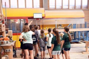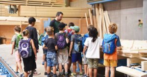 Zunächst haben Firmenchefin Tanja Rombach und Zimmerermeister Matthias Kuderer den Kindern bei einer Führung durch die Produktion den Bau von Holzhäusern und Dächern kindgerecht erklärt.