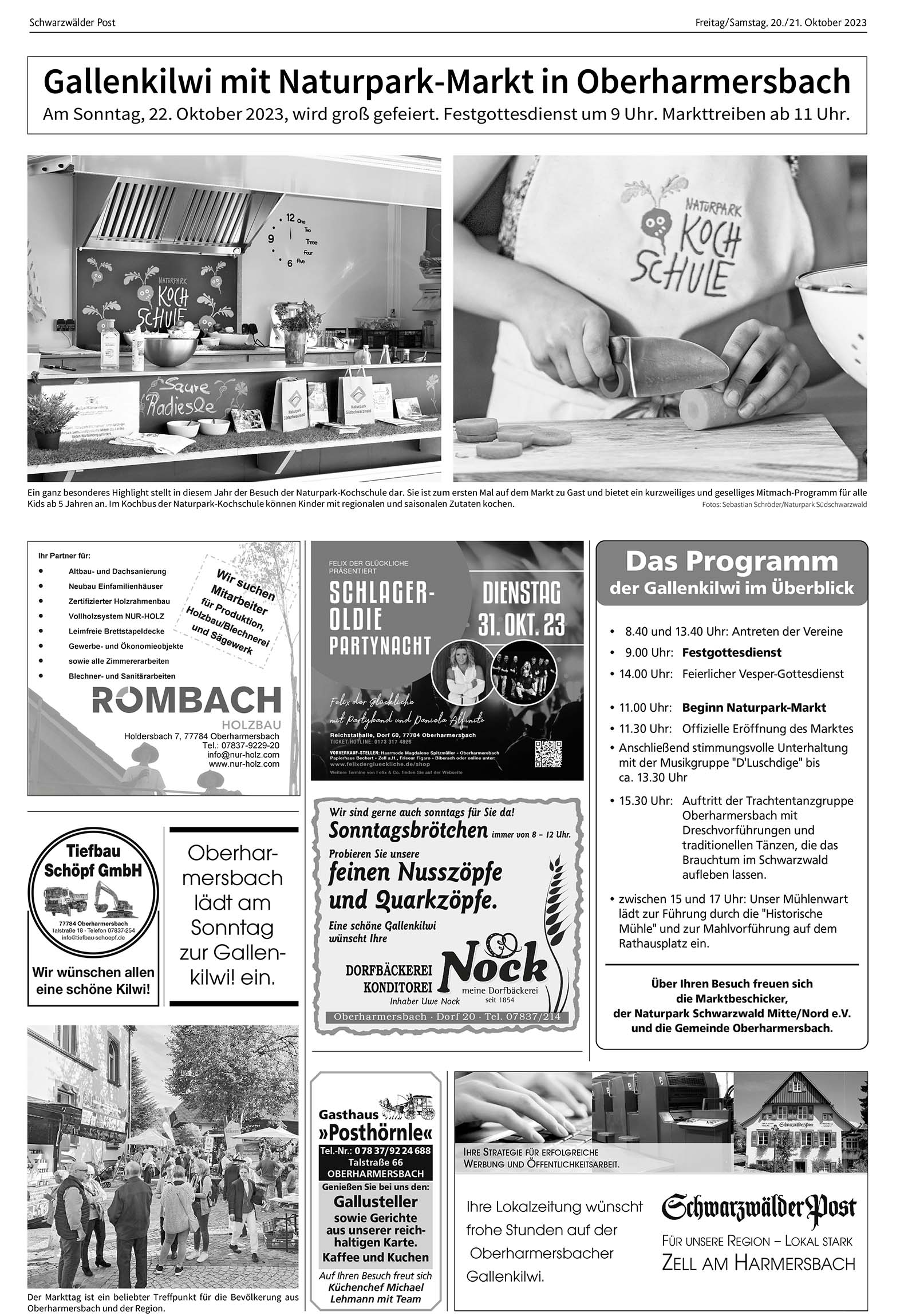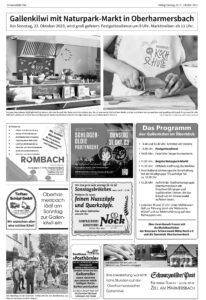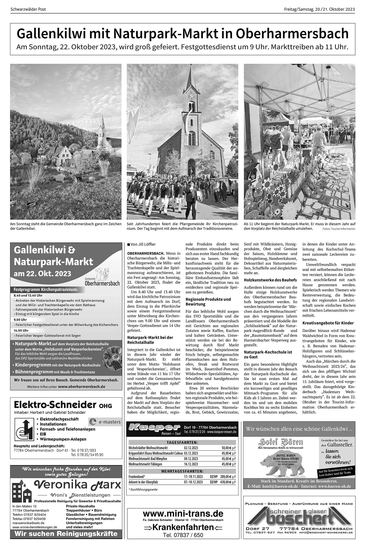 Oberharmersbach | 20.10.2023 Gallenkilwi mit Naturpark-Markt in Oberharmersbach Foto:Seit Jahrhunderten feiert die Pfarrgemeinde ihr Kirchenpatrozinium. Der Tag beginnt mit dem Aufmarsch der Traditionsvereine. Foto: Touristen-Info von Jill LöfflerAm Sonntag, 22. Oktober 2023, wird groß gefeiert. Festgottesdienst um 9 Uhr. Markttreiben ab 11 Uhr. Foto: Touristen-Info Foto: Touristen-InfoDas könnte Sie auch interessieren:Foto: Unternehmen Ein starkes Zeichen für SolidaritätFoto: Lehmann-ArchivKaum Lücken im VeranstaltungskalenderFoto: Archivfoto: Inka Kleinke-BialyBiberacher Weihnachtsmarkt lädt zum…