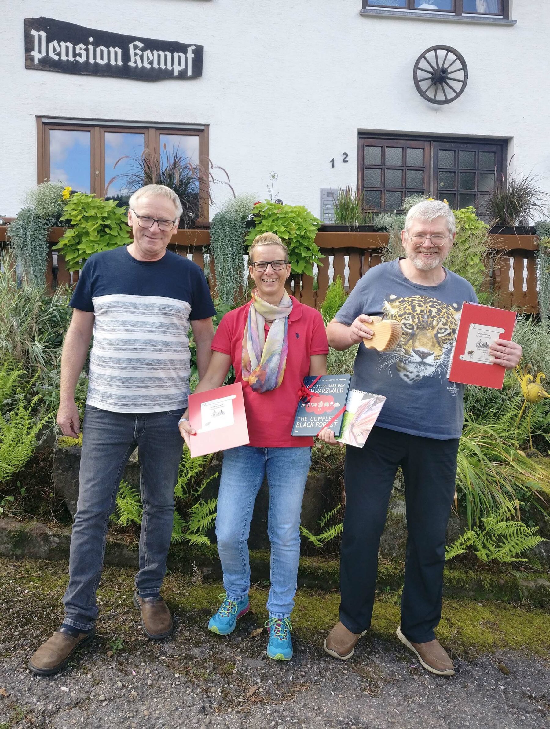 Nach dieser Anekdote wurde von Jill Löffler, die den Jubilaren das Buch „Total alles über den Schwarzwald“, einen Fotokalender und Schlüsselanhänger als Dankeschön für ihre Urlaubstreue überreicht hatte, noch ein Erinnerungsfoto an diesen besonderen Tag geknipst.
