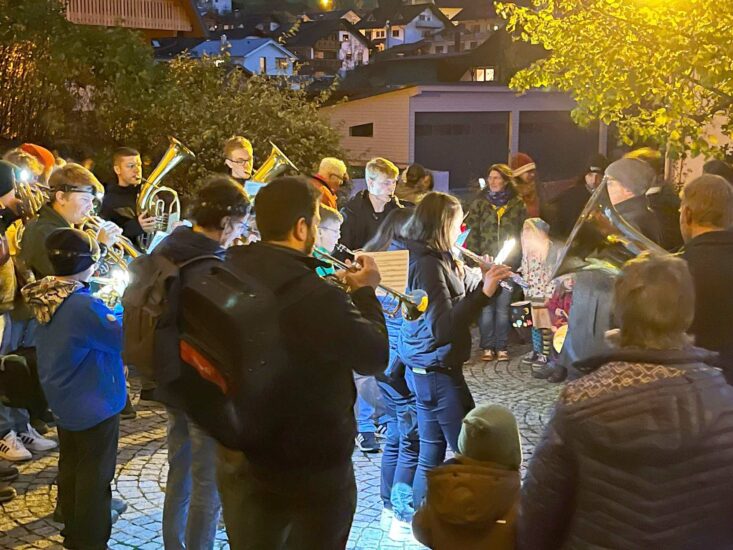 Die Jugendkapelle begleitete anschließend auch den Laternenumzug der Kinder mit Sankt Martin, gespielt von Constanze Lehmann. Das Wetter hatte in diesem Jahr hervorragend mitgespielt, sodass sich die Kinder mit ihren Eltern auf dem mit Laternen und Lampions stimmungsvoll beleuchteten Schulhof gemütlich zu einem Imbiss treffen konnten.