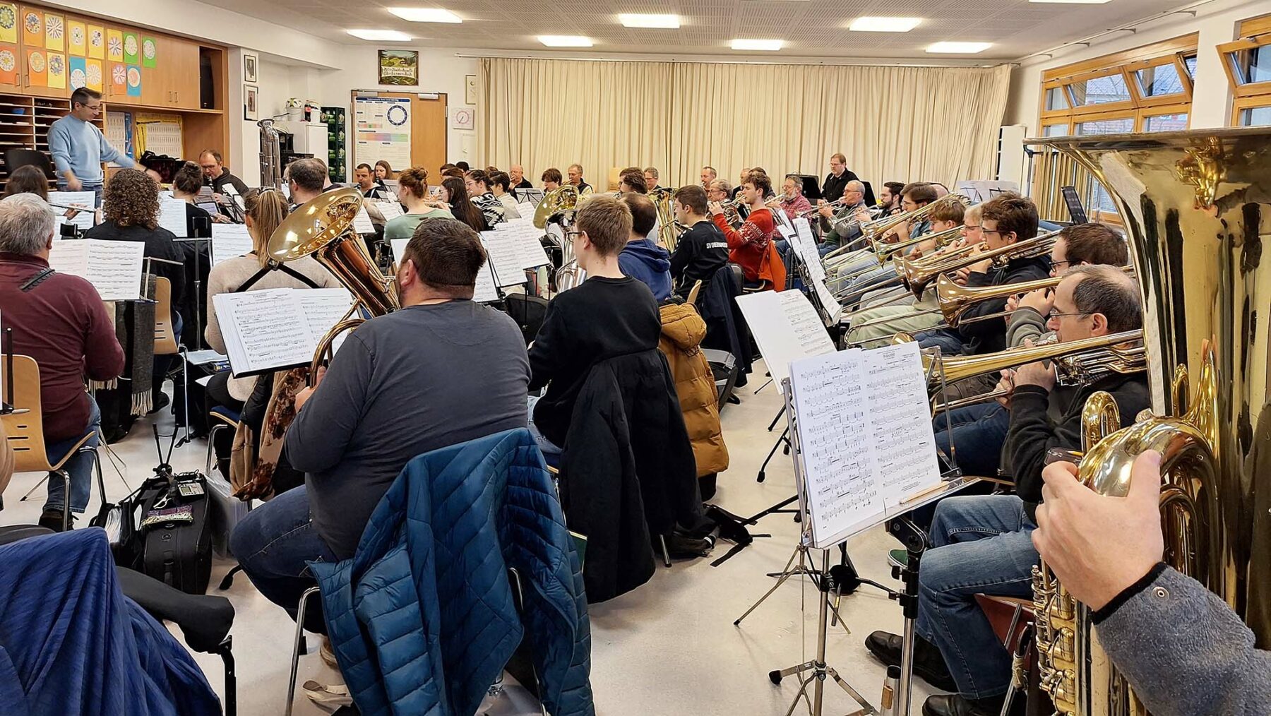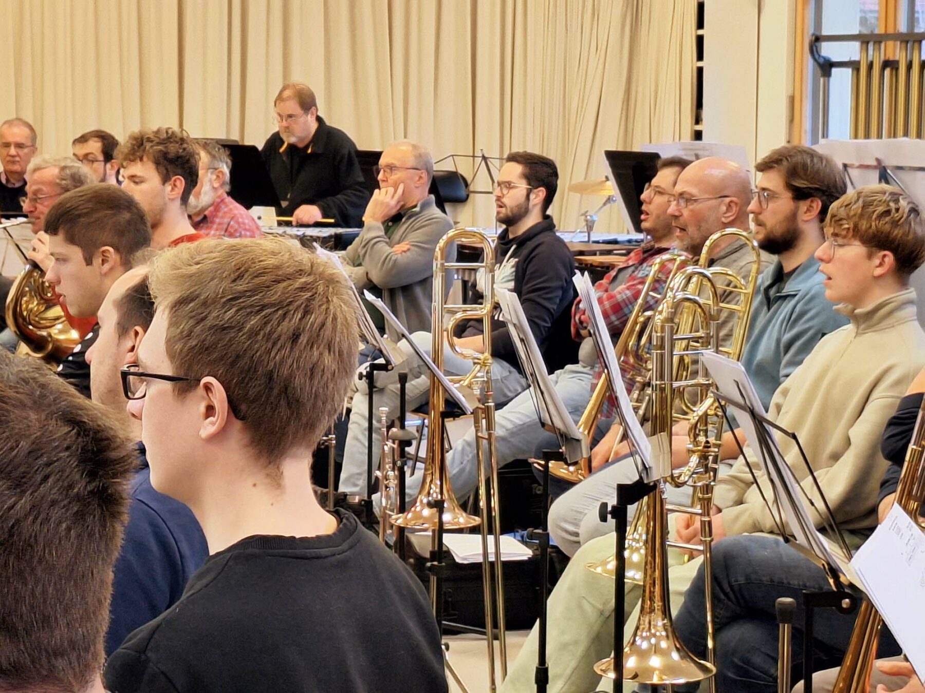 Am vergangenen Wochenende kamen die rund 65 Musikerinnen und Musiker zur Vorbereitung auf das Weihnachtskonzert zu einem intensiven Probenwochenende zusammen. Nachdem am Freitagabend eine Gesamtprobe anstand, trafen sich die einzelnen Register am Samstagvormittag. Die Zeit wurde teils mit externen Dozenten dafür ge-nutzt, um die ein oder andere schwierigen Stellen hinsichtlich Technik, Intonation und Klang gemeinsam zu üben. Anschließend probte Rüdiger Müller am Samstagnachmittag und Sonntagvormittag die sechs Werke für das anspruchsvolle Programm mit dem Gesamtorchester.