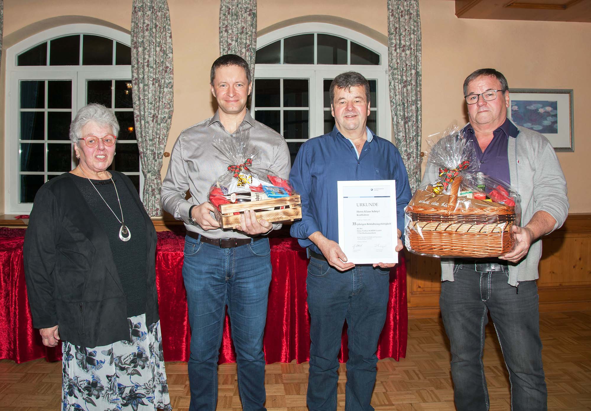 „Ehrungen für langjährige Betriebszugehörigkeit sind keine Pflichtveranstaltung, sondern ein Gütesiegel jeder Firma“, lobte die Geschäftsführe-rin Brigitte Huber das langjährige Engagement der Jubilare Bernd Schmieder gehört seit zehn Jahren zur Firma Schöpf. Als Kraftfahrer lenkte er in dieser Zeit den ersten Vierachser unfallfrei. Seit 35 Jahren ist Klaus Schöpf ebenfalls als Lkw-Fahrer unfallfrei unterwegs, hin und wieder auch eingesetzt auf dem Bagger oder der Raupe. Ferner sind in der Werkstatt seine Fachkenntnisse bei kleineren und größeren Reparaturen gefragt. Mit Präsenten bedankte sich die Geschäftsleitung bei den Geehrten.
