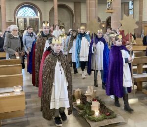 Im ersten Gottesdienst des Jahres 2024 zogen die 15 Sternsinger und Sternsingerinnen gemeinsam mit ihren Begleiterinnen und Pater Christoph in die Pfarrkirche ein, um ihre gesammelten Gaben zu überbringen.