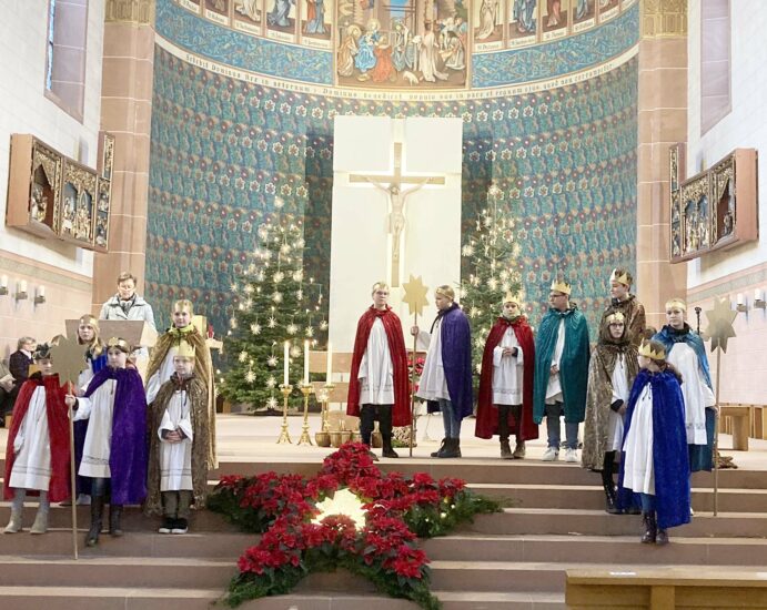 Am Ende des Gottesdienstes legten die Sternsinger ihre Kronen vor dem Altar ab, als Zeichen dafür, dass Jesus unser aller Herr und König ist. „Unser Auftrag ist mit diesem Gottesdienst aber noch nicht beendet. Wir wollen das ganze Jahr über Sternsinger sein und uns für ein menschenwürdiges Leben aller einsetzen“, erläuterte der Sternsinger Lukas Lemke diese Geste. Die zahlreich anwesenden Gottesdienstbesucher belohnten den Einsatz der Kinder und ihrer Begleiter nochmals mit einem kräftigen Applaus.
