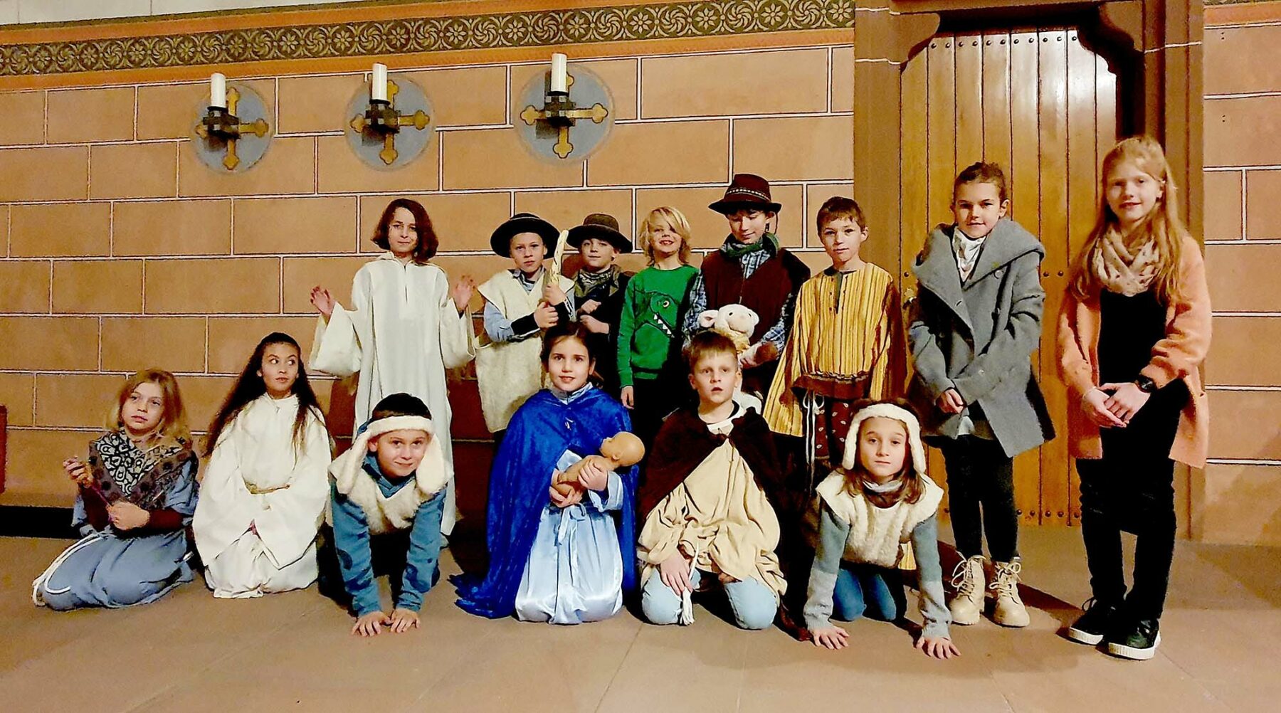 Gestaltet wurde er vom Erstkommunion-Team rund um Stephanie Kasper, Kathrin, Martina, Nicole und Tanja Lehmann sowie Mathilde Zimmermann und den Kommunionkindern 2024. Sehr viel Liebe zum Detail steckte unter anderem in der Auswahl der Lieder, die von Nicole Lehmann an Querflöte und Gitarre und einem kleinen Chor begleitet wurden, der Darstellung des „Wunders von Weihnachten“ in einem Krippenspiel, das die Kommunionkinder gekonnt mit Leben füllten und den anderen Gottesdienstinhalten, die von Diakon Matthias Hoppe angeleitet wurden.