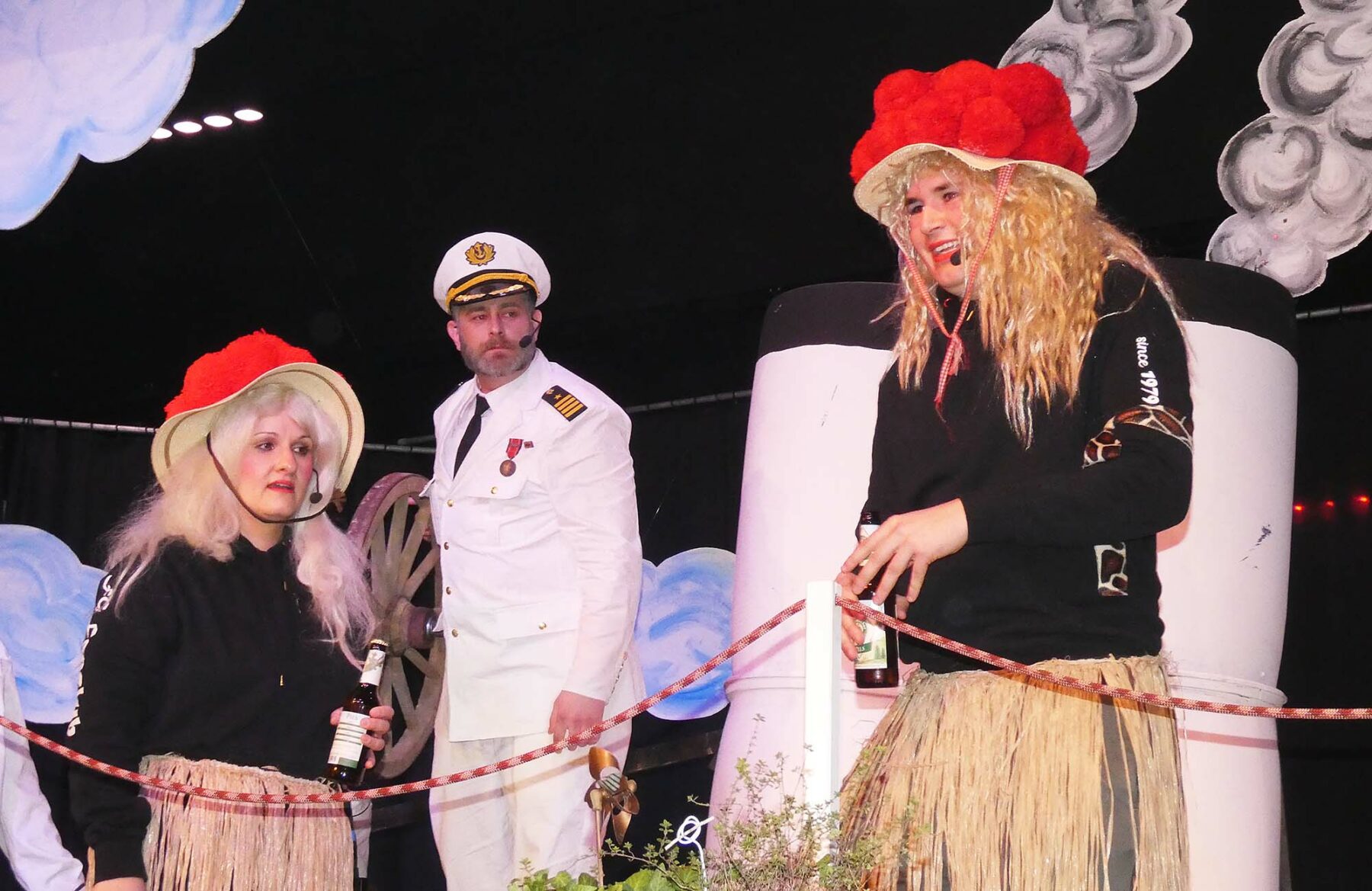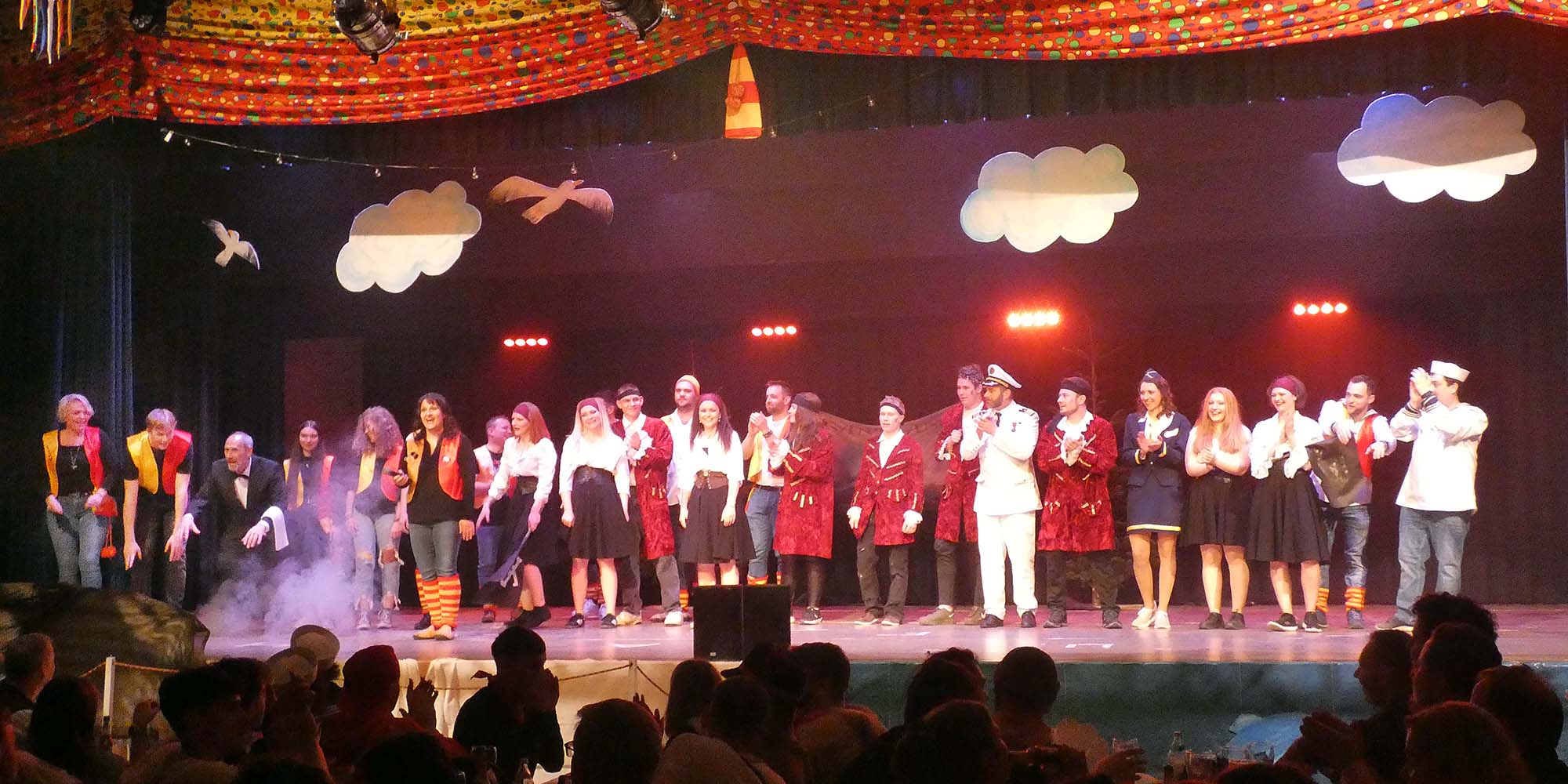 Zwischendurch wird mal vom Matrosenballett (das einen angriffslustigen Hai zerfleddert) und mal vom Publikum das Tanzbein geschwungen. Woraufhin es weitergeht mit dem vermeintlichen „Ballermann von Oberharmersbach“, einem Feuerwehralarm wegen eines Bierlagerbrandes, einer misslungenen Schiffstaufe, einem durchtrainierten Baywatch-Star (der eine hübschbeinig strampelnde Helene Fischer aus den Fluten rettet), einem blinden Passagier (der klammheimlich von der Bühne robbt), einem glücklichen Fitness-Felix und einigem mehr. Enden kann das alles natürlich nur: in einem Überfall durch „ALPIRaten“, die das Tanzbein sehr bald gleichfalls juckt.