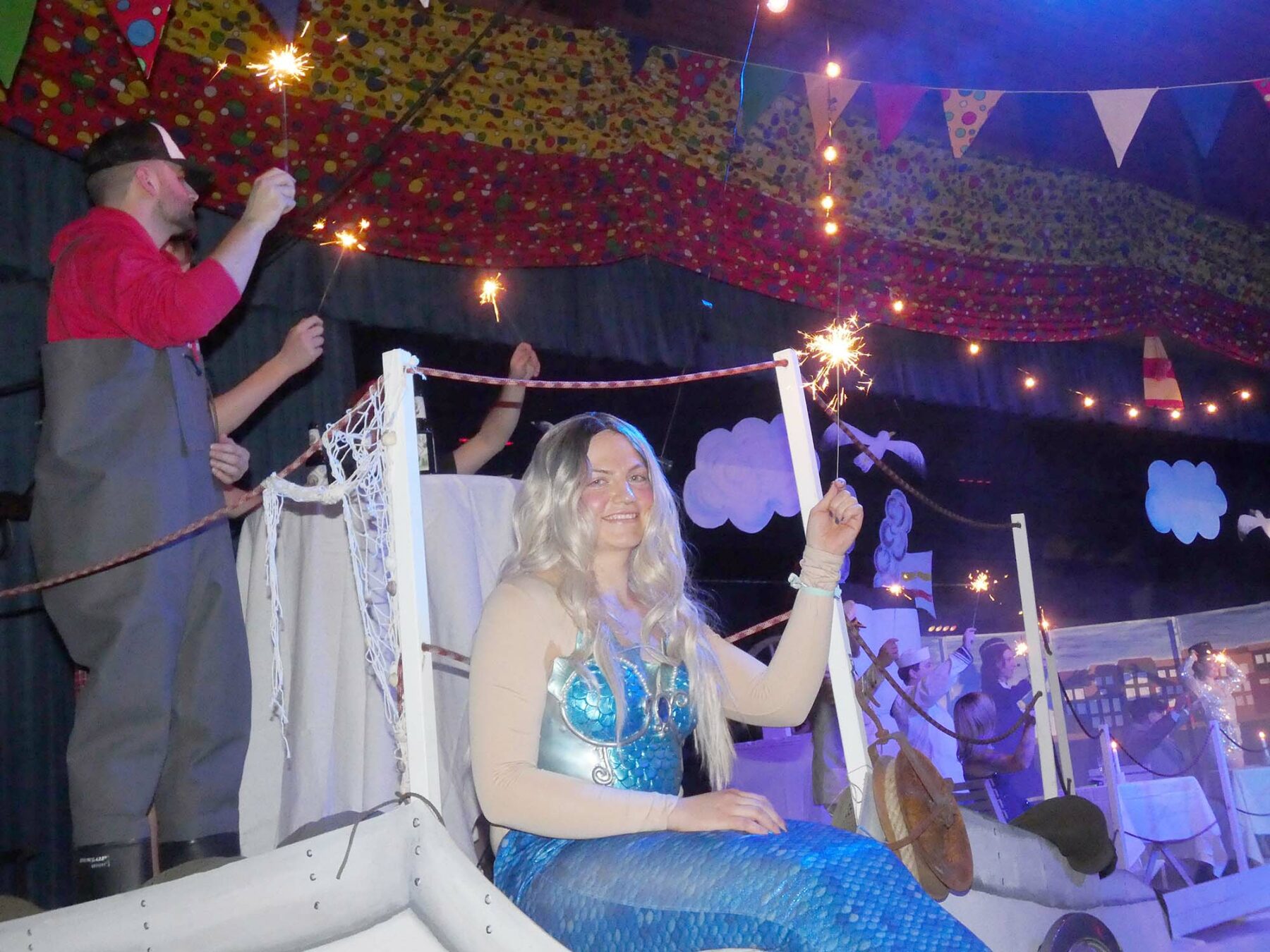 Für seine Jungfernfahrt wurde das im Wasser schwimmende Schiff, zu dem die Bühne umgebaut worden war, von fleißigen Matrosen zunächst auf Hochglanz geschrubbt. Nur eine an der Reling hängende Klimakleberin lässt sich nicht entfernen. Dank ihres flugs für einen ölverschmierten Maschinisten entflammten Herzens entklebt die Schöne sich jedoch, um fortan meerjungfräulich als „Geillionsfigur“ zu fungieren.