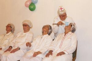 Der Tanz der „Bärenkinder“ kam so gut an, dass die Senioren stürmisch eine Zugabe forderten, was die Kinder bereitwillig gewährten. Zur Kaffeezeit schließlich eroberten „Felix und seine Luschdige“ den Saal und brachten die Senioren mit allerhand spontanen Späßen und viel Musik zum Lachen und Schunkeln.