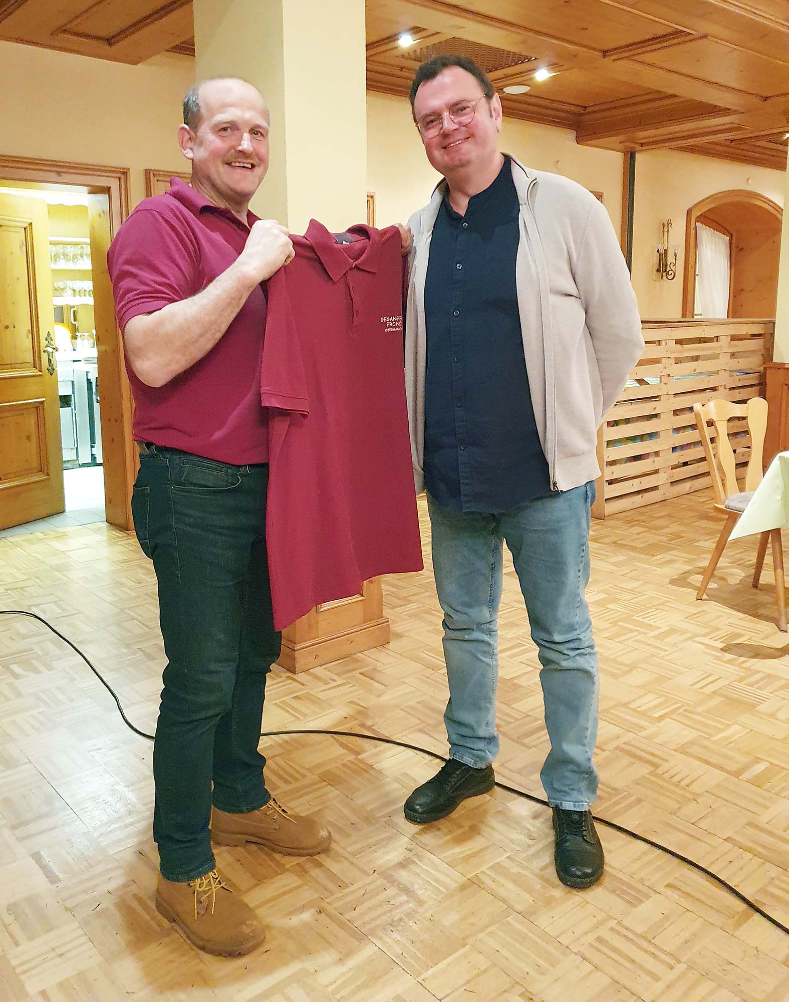 Im Zuge der Beschaffung weiterer Vereinskleidung ist nun auch endlich Dirigent Viktor Kraus (rechts) ordentlich ausgestattet. Er bekam das T-Shirt des Vereins vom 1. Vorsitzenden Stefan Lehmann (links) überreicht.