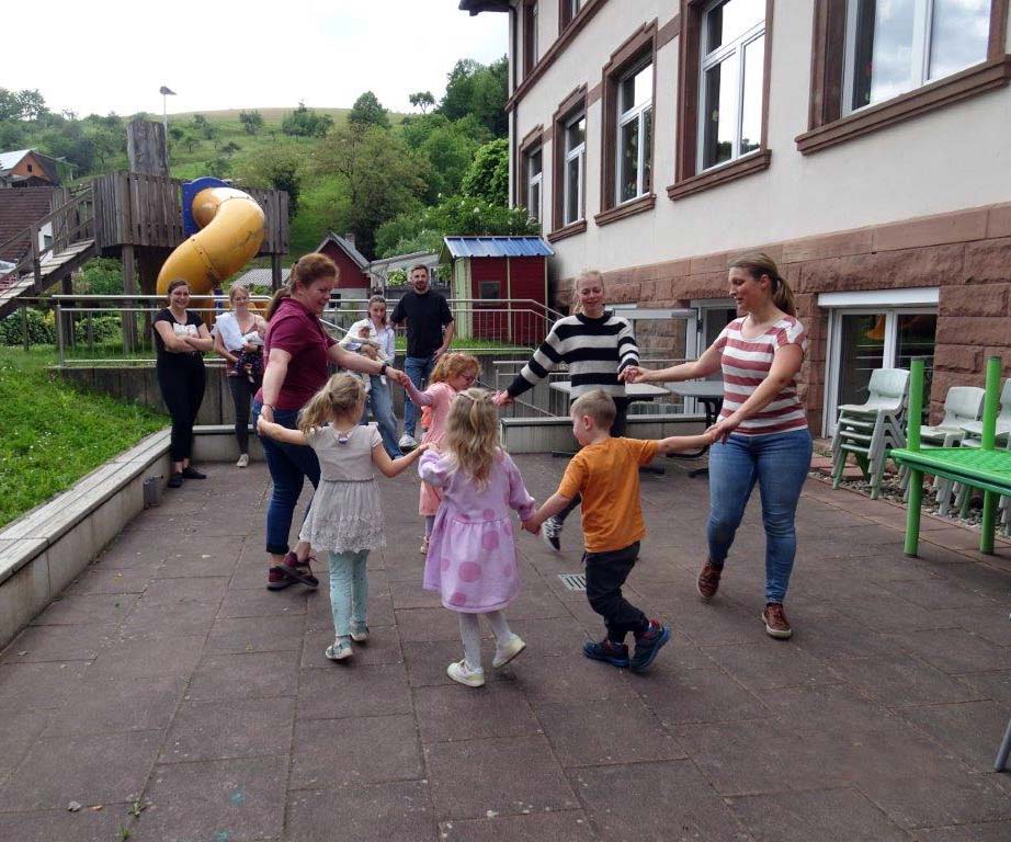 Gegen Ende des Nachmittags war die Aufregung nochmals groß, denn die einstudierten Tänze wurden nun den Eltern auf der Terrasse im Kindergartenhof vorgeführt.