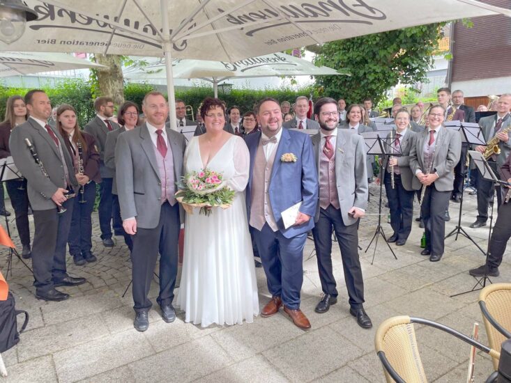 Los ging’s schon mit der Abholung von zu Hause durch die Trachtenkapelle Oberharmersbach. Den festlichen Gottesdienst in der Kirche gestaltete der Musikverein „Orgelfels“ Reichental mit, das ist der Heimatverein des Bräutigams. Und auch der Gesangsverein „Frohsinn“ Oberharmersbach hat dem Brautpaar musikalisch die Ehre erwiesen.