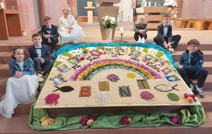 „Mit Jesus ist mein Leben BUNT“ so lautete das diesjährige Erstkommunionthema in Ober harmersbach. Unter diesem Leitspruch ließen es sich die Kommunionkinder nicht nehmen und gestalteten mit Hilfe einiger Mamas und des Be treuerteams einen wunderschönen Blütenteppich. In liebevoller Kleinarbeit aus vielen verschiedenen bunten Blütenblättern entstand so ein richtiges Kunstwerk. Nur gemeinsam war diese Leistung zu erbringen. Zusammen besuchten die Kinder am Donnerstag den Festgottesdienst und die Prozession und präsentierten stolz ihr gelungenes Endergebnis.