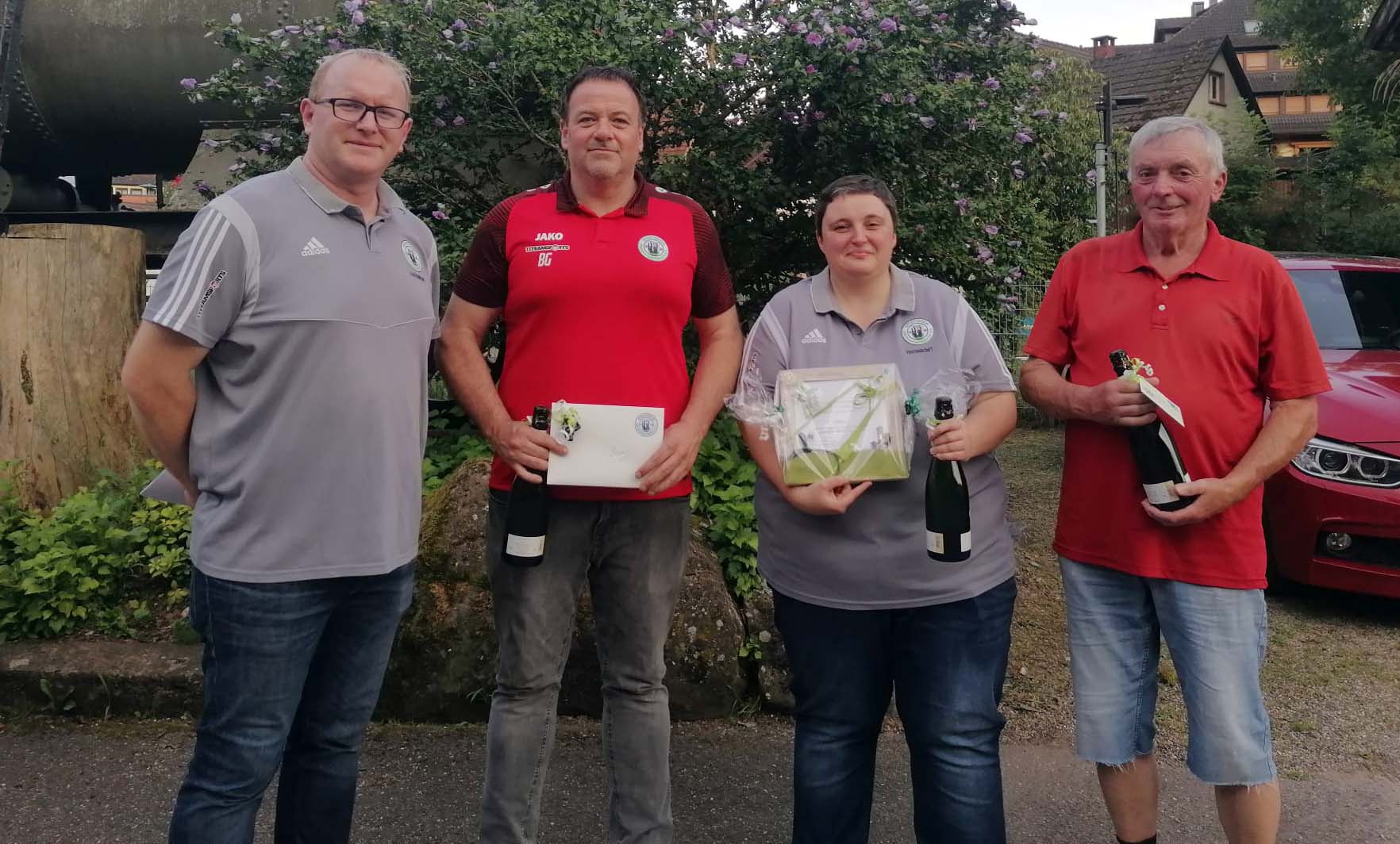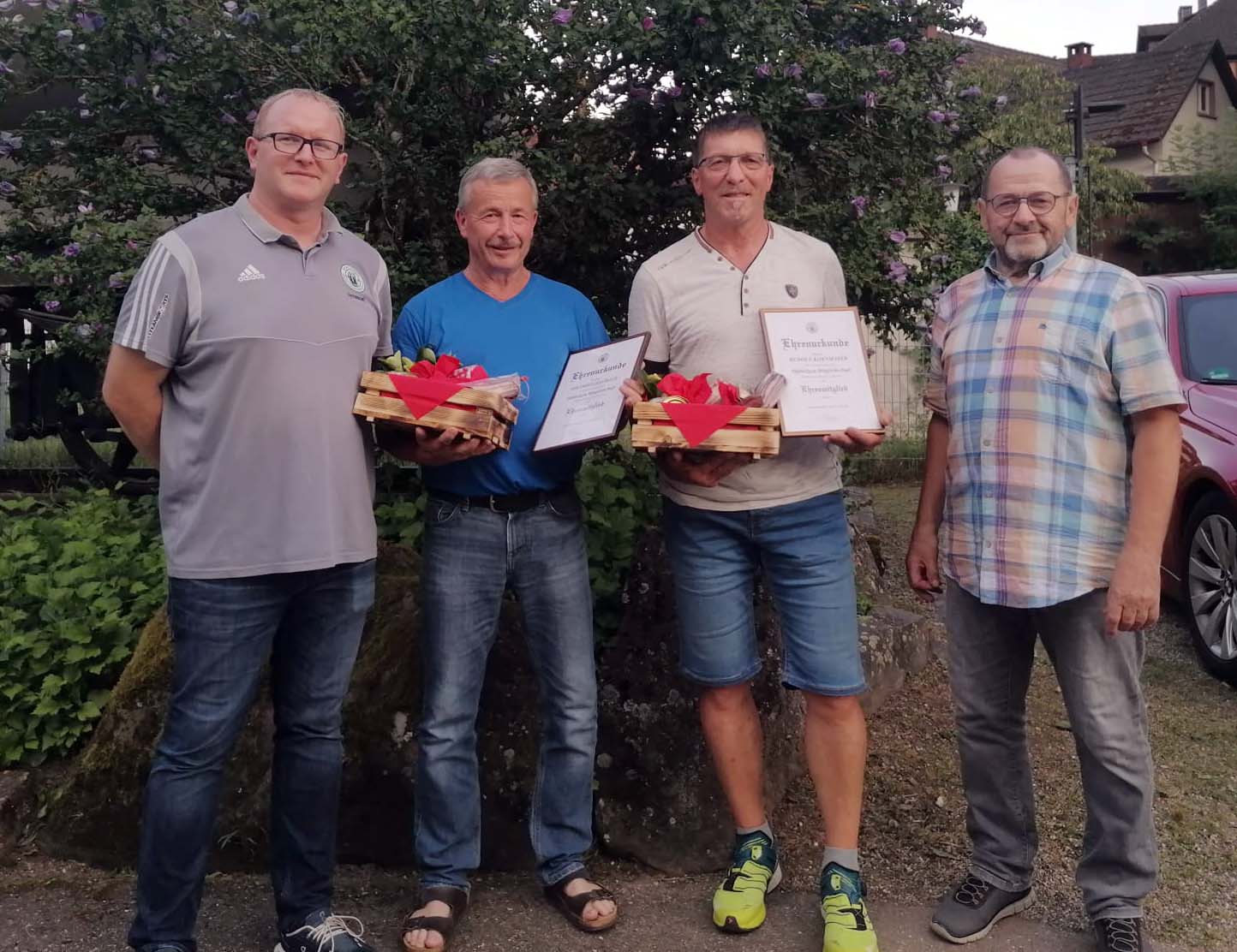 Franz Hug, ehemaliger Vereinsvorstand und Ehrenamtsbeauftragter, nahm die Ehrungen für langjährige Mitgliedschaft vor. Für 15 Jahre ununterbrochene aktive Vereinszugehörigkeit erhalten Marcel Lehmann und Mike Gutmann im Nachgang die Vereinsnadel in Silber. Beide ließen sich für die Sitzung entschuldigen. Als neue Ehrenmitglieder bestätigte die Versammlung Wilfried Haubold, sowie Rudolf Kornmayer. Den ausscheidenden Vorstandsmitgliedern Jasmin Kornmayer und Benny Gutierrez sowie Platzwart Albert Kornmayer wurde ebenfalls als Dank für ihre Verdienste jeweils ein Präsent überreicht.