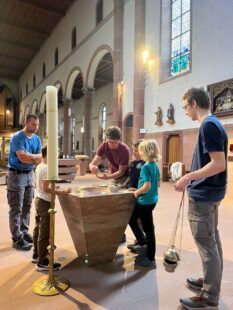 Gemeinsam mit Oliver Lemke durften sie sich im Chorraum umsehen. Besonders spannend fanden sie es dabei, Fehlerchen in der Bemalung der Wände zu finden. Aber auch die Informationen zum Tabernakel, Taufbecken und den Reliquien unter dem Altar sorgten bei ihnen für gespitzte Ohren. Ein weiterer Raum, der zuvor im Verborgenen geblieben war, wurde den Kindern von Marc Herrmann nähergebracht. Er ließ sie in der Sakristei die vielen Gewänder und Stolen begutachten, die von Pfarrer und Diakon zu verschiedenen Anlässen getragen werden. Auch die Monstranz konnte hier in aller Ruhe bestaunt werden.