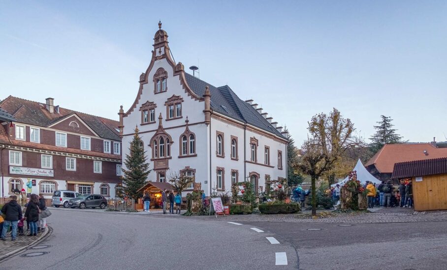 Am 1. Adventswochenende beginnen die „Märchenhaften Weihnachtsfreuden“ in Oberharmersbach. Auf dem Rathausplatz erwartet die Besucher ein schöner Weihnachtsmarkt und ein zauberhaftes Programm. Foto: Tourist-Info