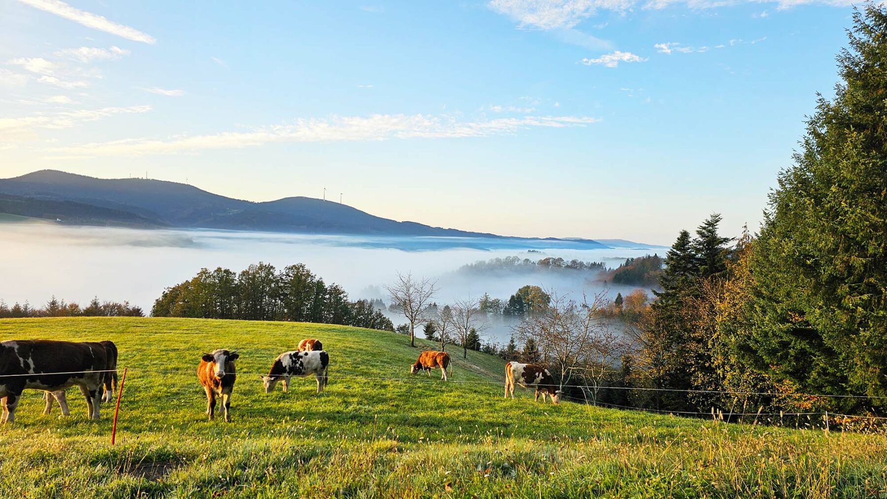 Unten im Harmersbachtal das Nebelmeer. Oben eine klare Aussicht zum Sonnenaufgang. Die Inversionswetterlage beschert oberhalb des Jauschbachtals in Oberharmersbach zauberhafte Herbstmotive.