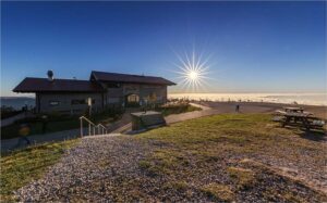 Die Grinde-Hütte auf der Hornisgrinde bei strahlendem Sonnenschein – über dem Nebelmeer.