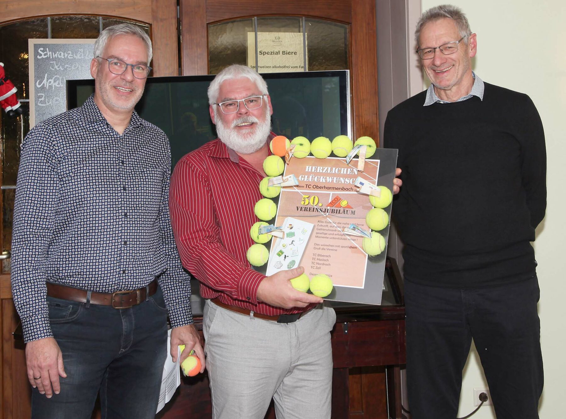 Stellvertretend für die Nachbarvereine Haslach, Biberach, Zell und Nordrach, mit denen der TCO die Tennishallen-GbR abgeschlossen hat, überreichten Manuel Schwendenmann (TC Zell) und Axel Christensen (TC Nordrach) mit den besten Wünschen ein Präsent und eine finanzielle Starthilfe für wichtige Anschaffungen.