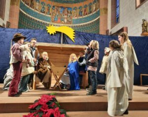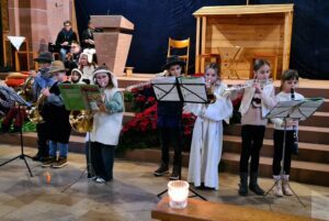 Viele Familien waren zusammengekommen, um sich in der festlich geschmückten Kirche auf Weihnachten einzustimmen. Zum Einstieg spielte ein Bläserensemble bestehend aus den Kindern Jakob Gutmann, Laila Huber, Mariella Hug, Emma Kempf, Jonas Kornmayer, Finn Kuderer und Jana Lehmann das Lied „Lieber, guter Nikolaus“. Danach spielten die Kinder mit viel Freude die Weihnachtsgeschichte vor.