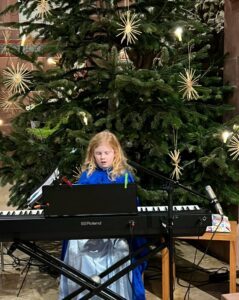 Neben vielen Weihnachtsliedern wurde am Ende des Krippenspiels auch noch von den Kommunionkindern das diesjährige Kommunionlied „Wie ein Fisch im Wasser, so leben wir in Gott“ gesungen. Bevor dann alle Kinder mit ihren Familien zur Bescherung nach Hause entlassen wurden, spielte Vivien Lehmann noch das Lied „Am Weihnachtsbaum, die Lichter brennen“ am Keyboard vor.