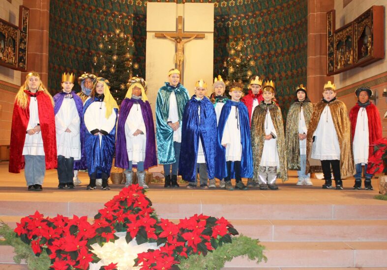 Im Gottesdienst am Dreikönigstag zogen die 16 Sternsinger und Sternsingerinnen gemeinsam mit ihren Begleiterinnen und Pater Irenäus in die Pfarrkirche ein, um traditionell ihre gesammelten Gaben zu überbringen.