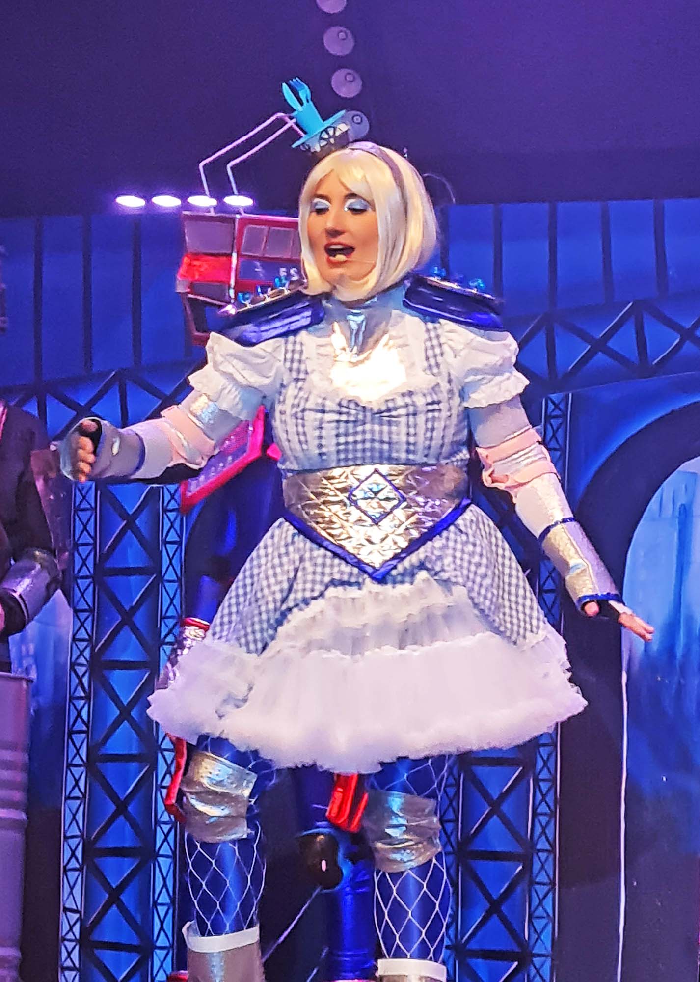 Ganz im Musical-Style und mit Rollschuhen unter den Füßen, stellten sich die Bewerber Bla-Bli-Bla-Blasmusik-Lok, Elektro-Schneider-Lok, Dörfle-Lok „alias geiler Ulle“, sowie die SWEG-Lok und ihre Waggons Leni’s Speisewaggon, Friseur-Waggons Magda und Britta, der Erste-Klasse-Waggon Perl und der Gemeinderat-Waggon mit live gesungenen Liedern vor. Begleitet wurden sie von der Liveband der Unterdorfer Narren, welche wie ein Orchester inmitten der Bühne ihren Platz gefunden hatten. Eine fulminante Lichtshow ließ die Besucher staunen.