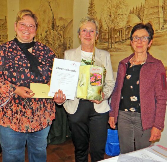 Anna Rombach wurde zum Ehrenmitglied der LandFrauen ernannt. Die Urkunde überreichte Monika Schnaiter vom Landesverband Südbaden, verbunden mit herzlichen Worten und einer zusätzlichen besonderen Geste: Anna Rombach erhielt eine Rose für ihren Garten, die als „LandFrauenRose“ extra gezüchtet wird. Anna Rombach reagierte überrascht und gerührt: „Vielen Dank – ich bin ganz überwältigt über die Ehre.“