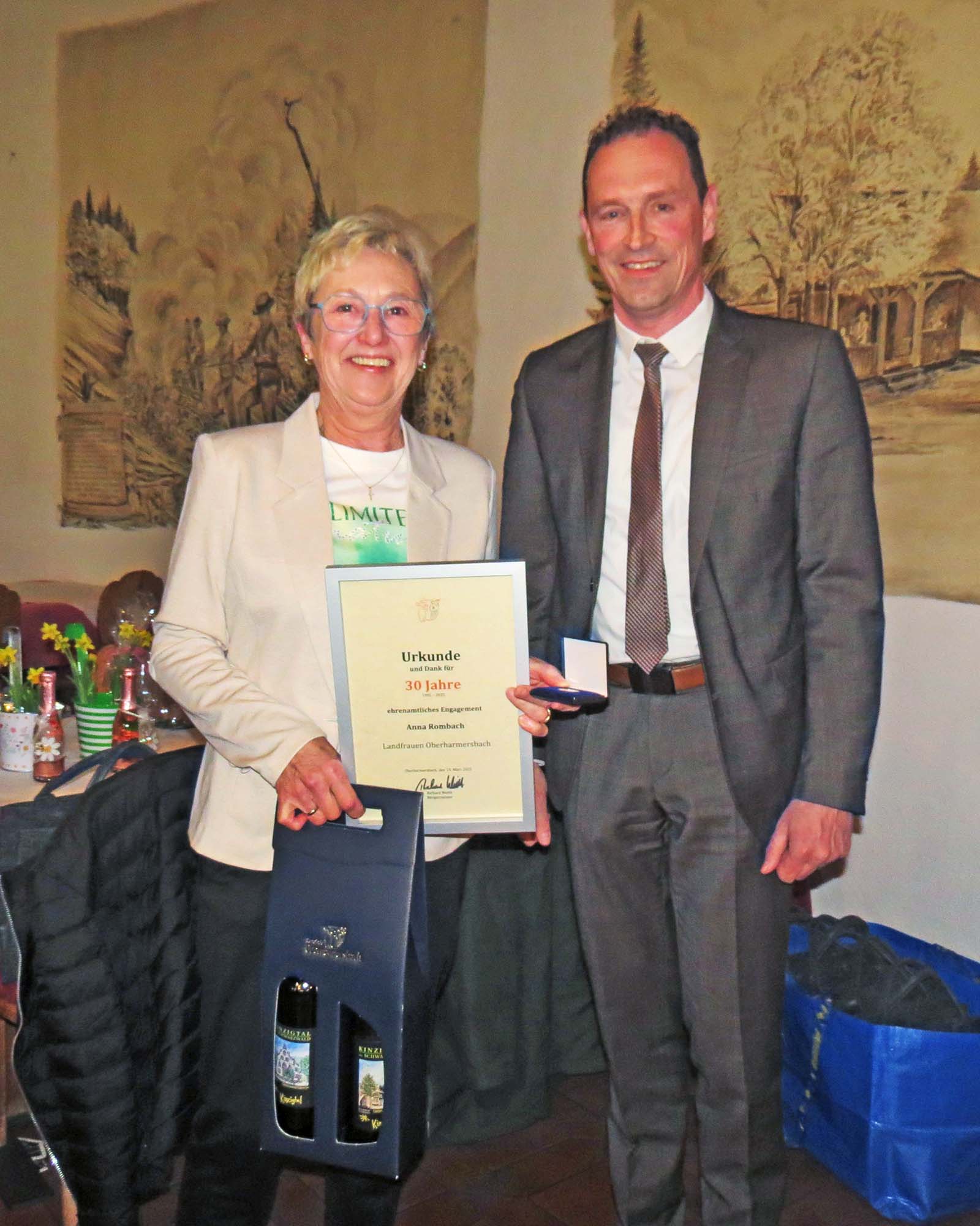 Die Vorsitzende der LandFrauen Ortsgruppe Magdalena Armbruster würdigte die Verdienste von Anna Rombach mit einer langen Rede. Rombach war 23 Jahre in der Vorstandschaft mit großem Engagement tätig. Ab 2002 war sie fünf Jahre Schriftführerin; neun Jahre als 1. Vorsitzende (zeitweise im 3-Team) und von 2016 bis jetzt weitere neun Jahre als 2. Vorsitzende in verantwortlicher Position.