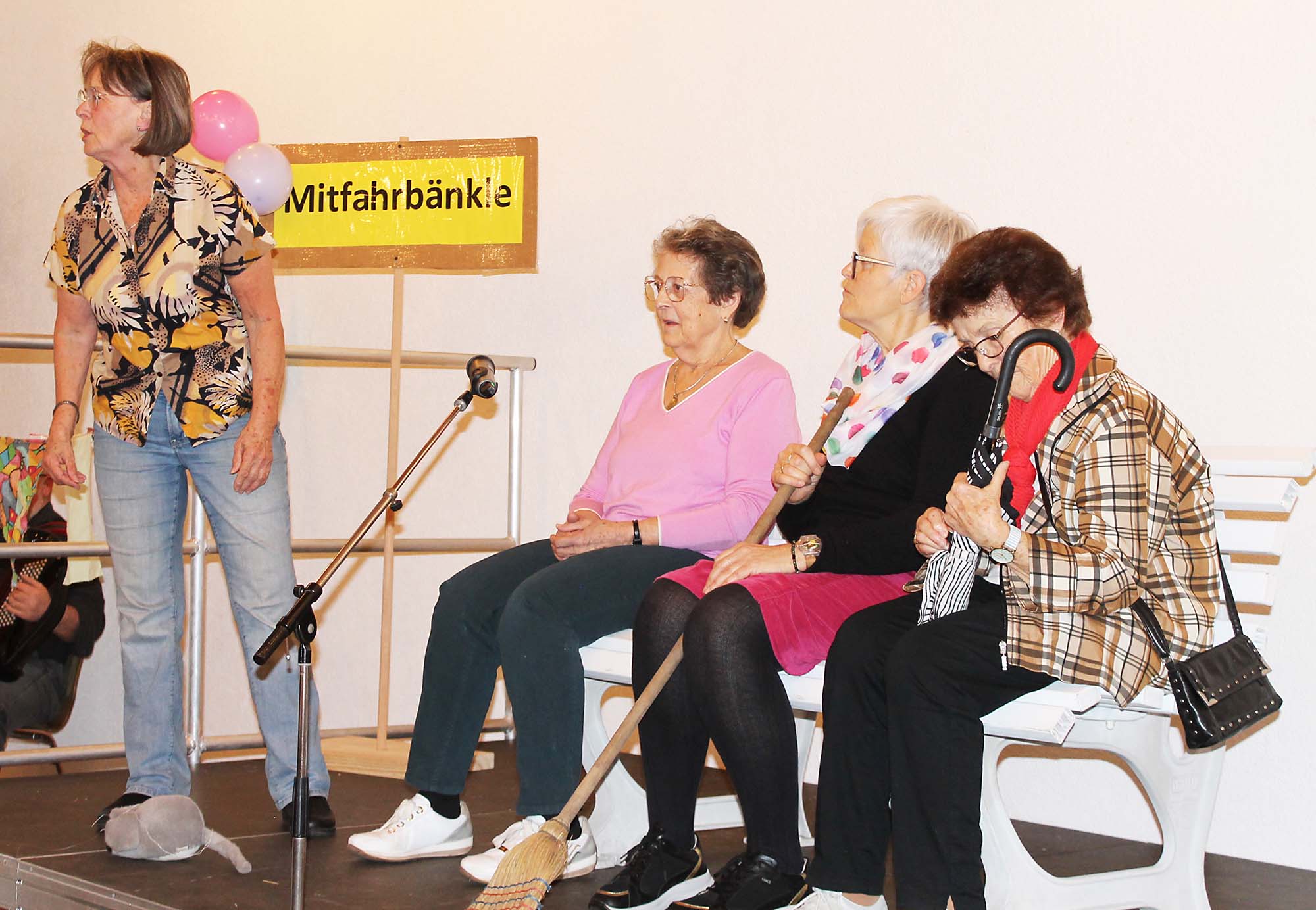 Auf dem „Mitfahrbänkle“ hatten wieder wunderfitzige Damen Platz genommen und tratschten angeregt über das Dorfgeschehen des vergangenen Jahres. Zur Kaffeezeit eroberten „Felix und seine närrischen Musikanten“ den Saal und brachten mit allerhand spontanen Späßen und viel Musik die Senioren zum Lachen und Schunkeln.