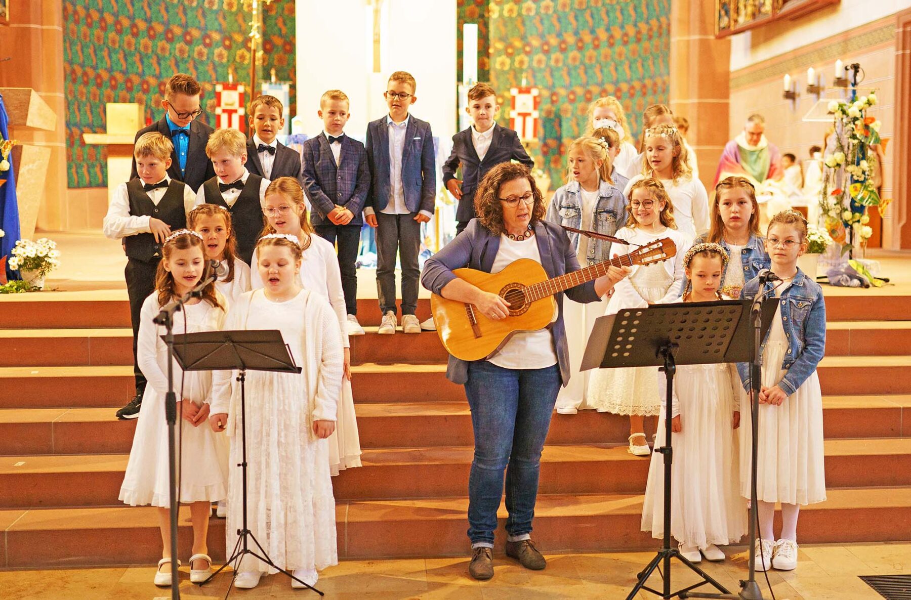 Pfarrer Bonaventura Gerner und zahlreiche Angehörige und Gläubige der Gemeinde feierten mit den Kindern einen wunderschönen, festlichen Gottesdienst. Die Kommunionkinder waren aktiv an der Gestaltung des Gottesdienstes beteiligt. Sie begrüßten die Gottesdienstbesucher und spielten eine Geschichte, passend zu ihrem Kommunionsthema vor. Sie trugen Gebete, Fürbitten und ihre Wünsche vor. Nicole Lehmann sang mit den Kindern ihr Kommunionlied „Wie ein Fisch im Wasser, so leben wir in Gott“.