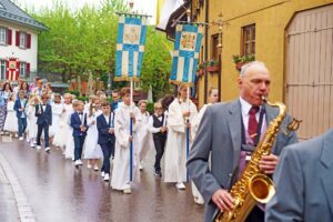 Nach dem Gottesdienst wurden die Kinder wieder von der Miliz- und Trachtenkapelle aus der Kirche zum Pfarrzentrum begleitet. Dort spielte ihnen die Musik noch ein Ständchen.