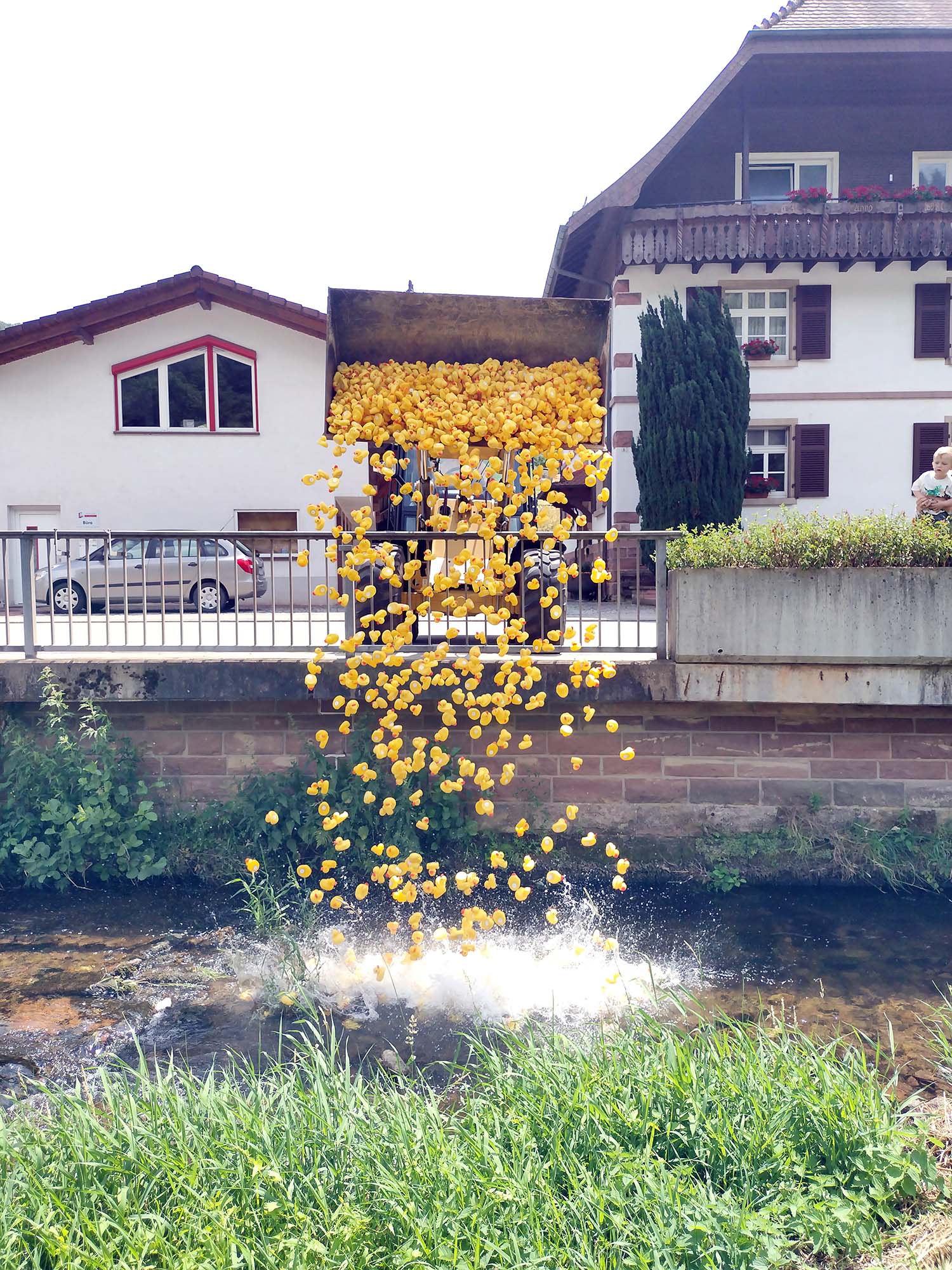 Traditionell startet das VdK-Entenrennen in Oberharmersbach spektakulär – ein Radlader entlässt über 2.000 quietschgelbe Teilnehmer gleichzeitig in den Harmersbach. Foto: Archivfoto: VdK