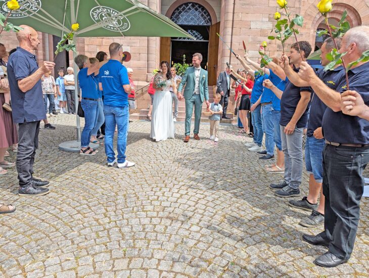 Nach dem feierlichen Auszug wurde das Brautpaar von einem Spalier empfangen. Die Bären der Narrenzunft Oberharmersbach begrüßten ihre „Bärin“ Sandra mit einem dreifach kräftigen „Hoch“. Auch die DJK ehrte ihre Kassiererin und ehemals Tischtennis-Spielerin. Kollegen aus dem elterlichen Familienunternehmen Tiefbau Schöpf überreichten gelbe Rosen und herzliche Glückwünsche. Und auch das Team der Volksbank Zell ließ es sich nicht nehmen, ihrer Kollegin in Elternzeit zu gratulieren.