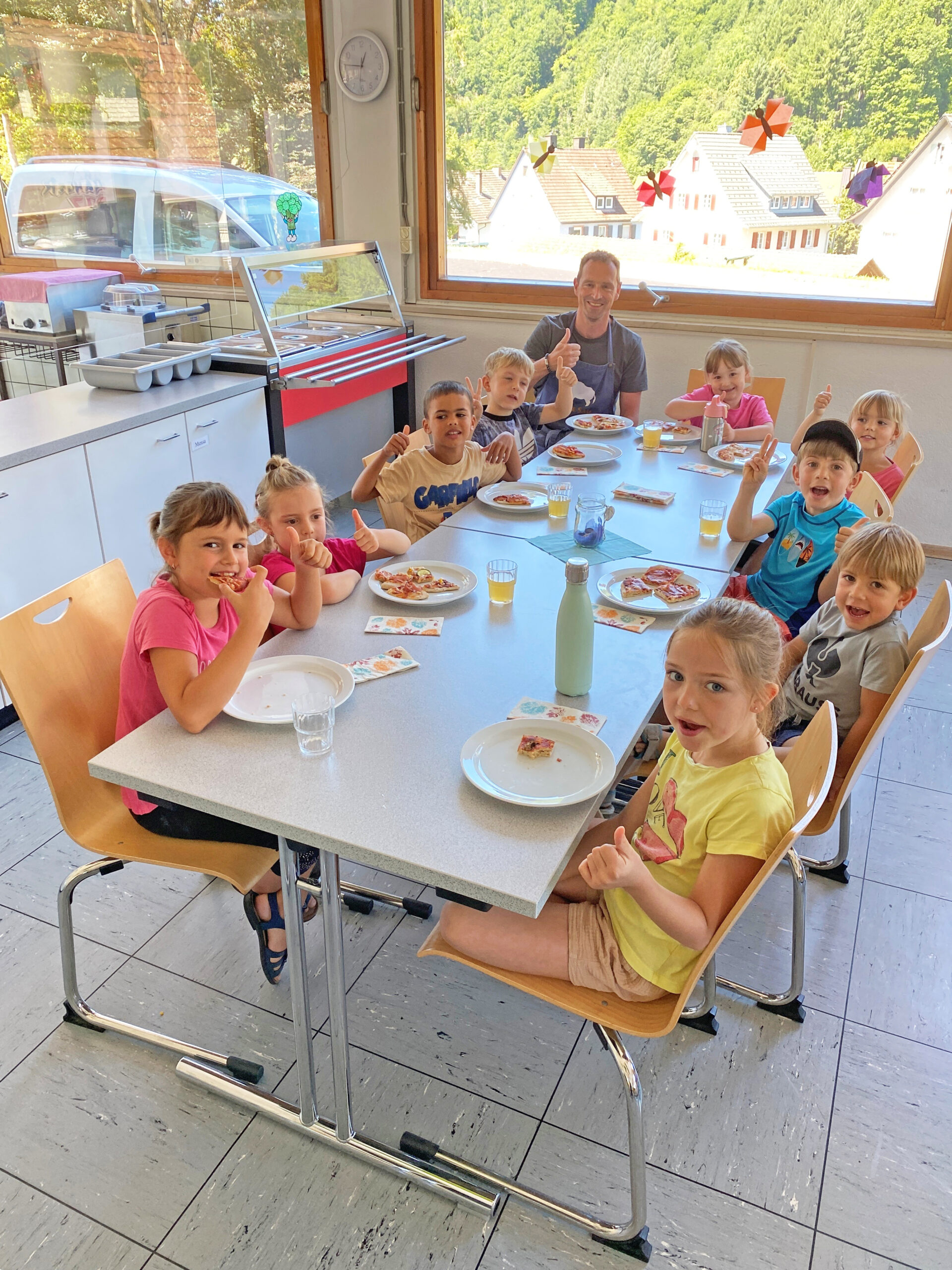 Auch Bürgermeister Richard Weith hat gemeinsam mit seiner Frau Anja in diesem Jahr wieder ein Programmpunkt angeboten: „Pizzabacken mit dem Bürgermeister“ war angesagt. Insgesamt neun Kinder im Alter zwischen 4 und 9 Jahren kamen morgens gut gelaunt und mit neugierigen Blicken in die Mensa-Küche der Brandenkopf-Schule.