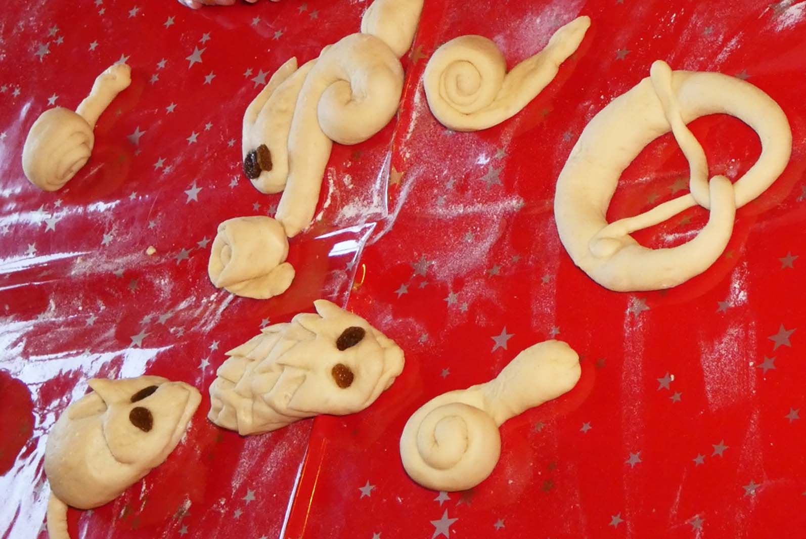 Im nächsten Schritt konnten die kleinen Bäcker ihrer Fantasie freien Lauf lassen. Sie formten aus dem Teig Gesichter oder gestalteten fantasievolle Gebilde. Bäckermeister Lehmann zeigte zudem, wie man mit einfachen Techniken kleine Tierfiguren entstehen lässt: Igel, Hase, Schnecke, Maus. Aber auch Brezeln und Knoten wurden hergestellt.