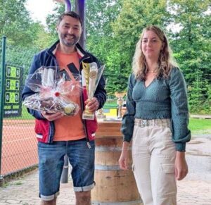 Martin Bajer (links) entschied das Finale der Herren 40 Konkurrenz für sich und bekam von Sportwartin Kristin Lehmann den Siegerpokal (rechts).