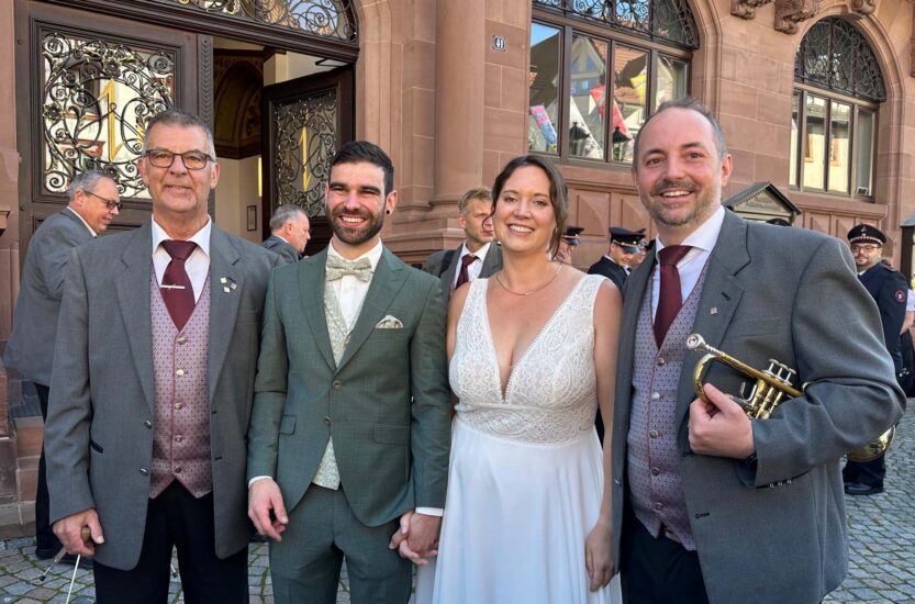 Da Isabel inzwischen in Wolfach lebt und auch Mitglied der Trachtenkapelle Kinzigtal ist, traten beide Musikvereine gemeinsam auf und sorgten für eine festliche musikalische Umrahmung. Vorstand Bastian Boschert überreichte dem Brautpaar im Anschluss einen Blumenstrauß und wünschte im Namen aller Musikerinnen und Musiker alles Gute für den gemeinsamen Lebensweg.