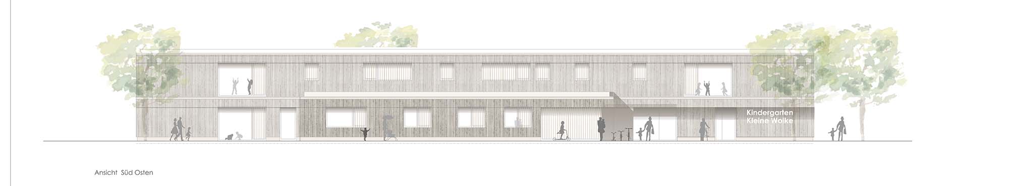 Das neue Kindergartengebäude wird für sechs Gruppen gebaut. Im Erdgeschoss sind zwei Gruppen für Kleinkinder unter drei Jahren untergebracht. Die vier Ü3-Gruppen befinden sich im zweiten Stock.