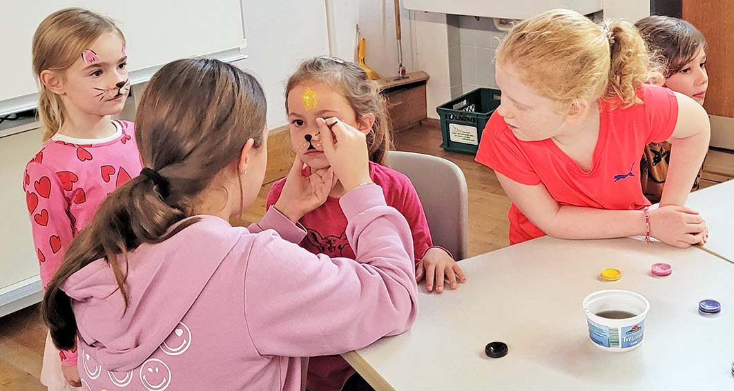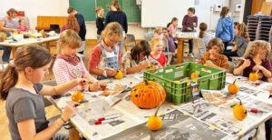 Bei der letzten Probe vor den Herbstferien verwandelte sich der Proberaum in eine kleine Halloween-Werkstatt. Die Kinder bemalten Kürbisse, probierten Schminke aus oder ließen sich schminken. Mit Naturmaterialien entstanden Spinnennetze samt passender Spinne. Viel Gelächter, viel Gewusel – und ein „Süßes oder Saures“-Buffet, das sofort zum Hit wurde.