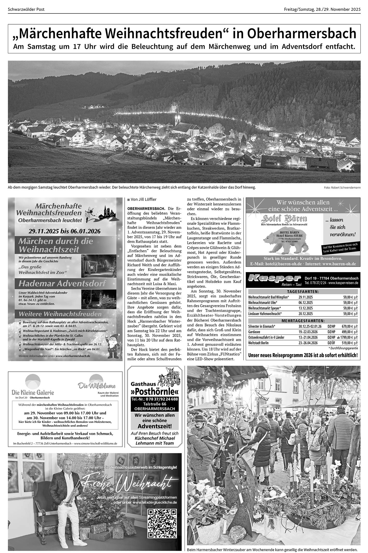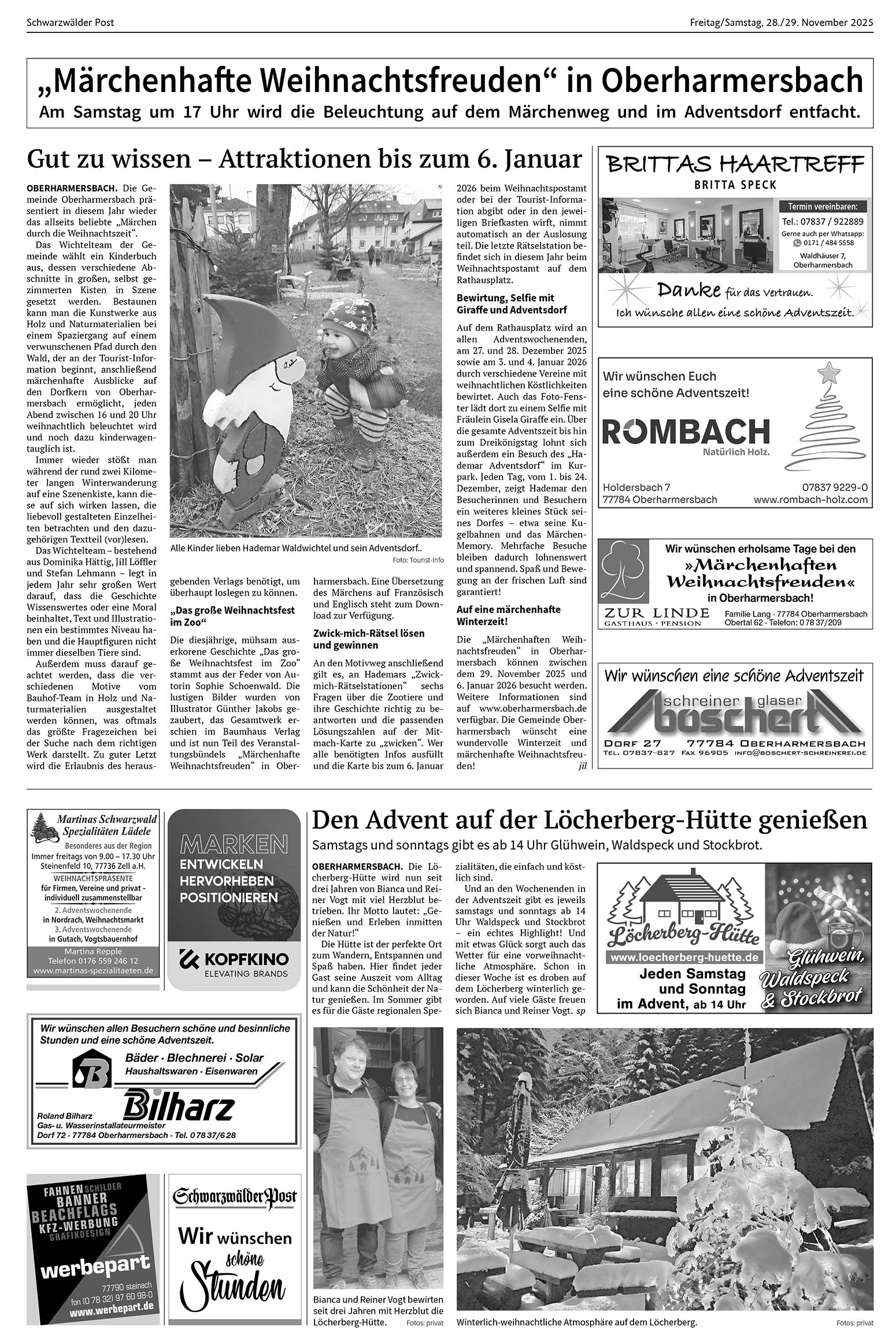 Am Sonntag, 30. November 2025, sorgt ein zauberhaftes Rahmenprogramm mit Auftritten des Gesangvereins Frohsinn und der Trachtentanzgruppe, Erzähltheater-Vorstellungen der Bücherei Oberharmersbach und dem Besuch des Nikolaus dafür, dass sich Groß und Klein auf Weihnachten einstimmen und die Vorweihnachtszeit am 1. Advent genussvoll einläuten können. Um 18 Uhr wird auf der Bühne vom Zirkus „FUNtastico“ eine LED-Show präsentiert.