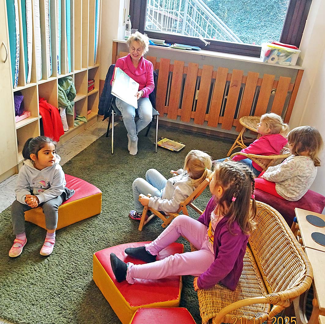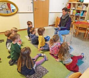 Kinderhaus-Leiterin Pamela Cruickshank ist es ein großes Anliegen, die Sprachentwicklung auf diese Weise zu fördern. Seit Mai gibt es im Kinderhaus den Lesewurm: Eine ehemalige Erzieherin kommt nun regelmäßig ehrenamtlich sowohl ins Haupthaus als auch in die Naturgruppe, um den Kindern vorzulesen.