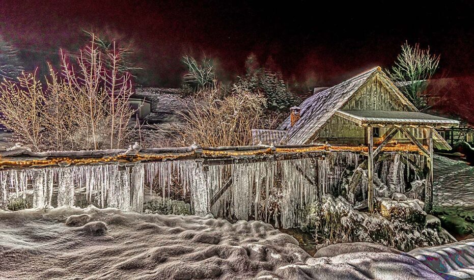 Die Benz-Mühle bei Ottenhöfen mit einem dicken Eispanzer und langen Eiszapfen. Inszeniert mit Kunstlicht bei Nacht. Foto: Robert Schwendemann